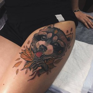牛仔短裤妹子的大腿彩色玫瑰猫咪肖像纹身图案